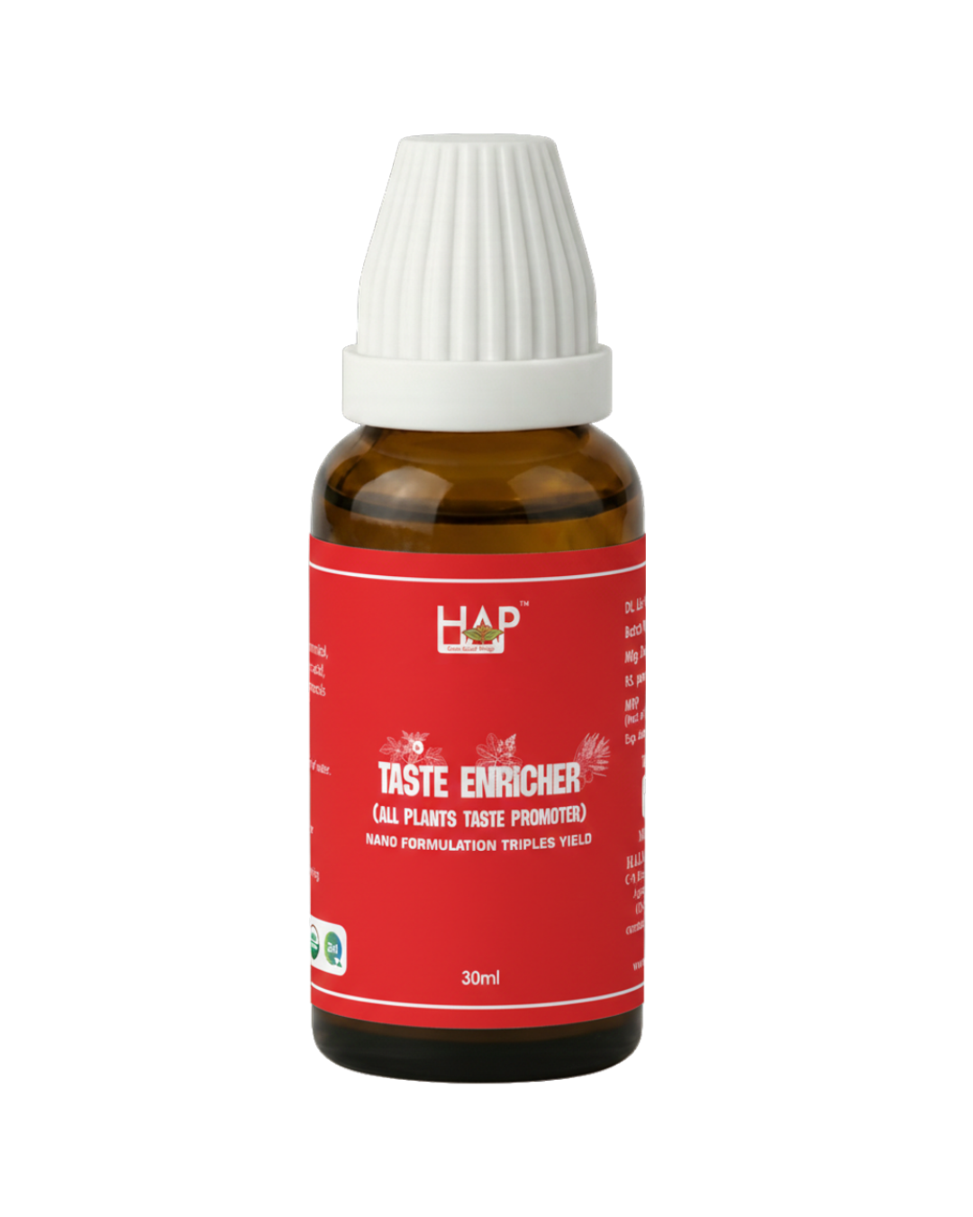 Taste Enricher is a natural and safe algal-based agro formulation specially developed to enhance the taste, aroma, and quality of vegetables and fruits. Enriched with marine algae extracts and essential bio-active compounds, it improves sugar content, flavor intensity, and overall palatability. Regular use supports healthy crop development while delivering superior taste and market-ready produce.